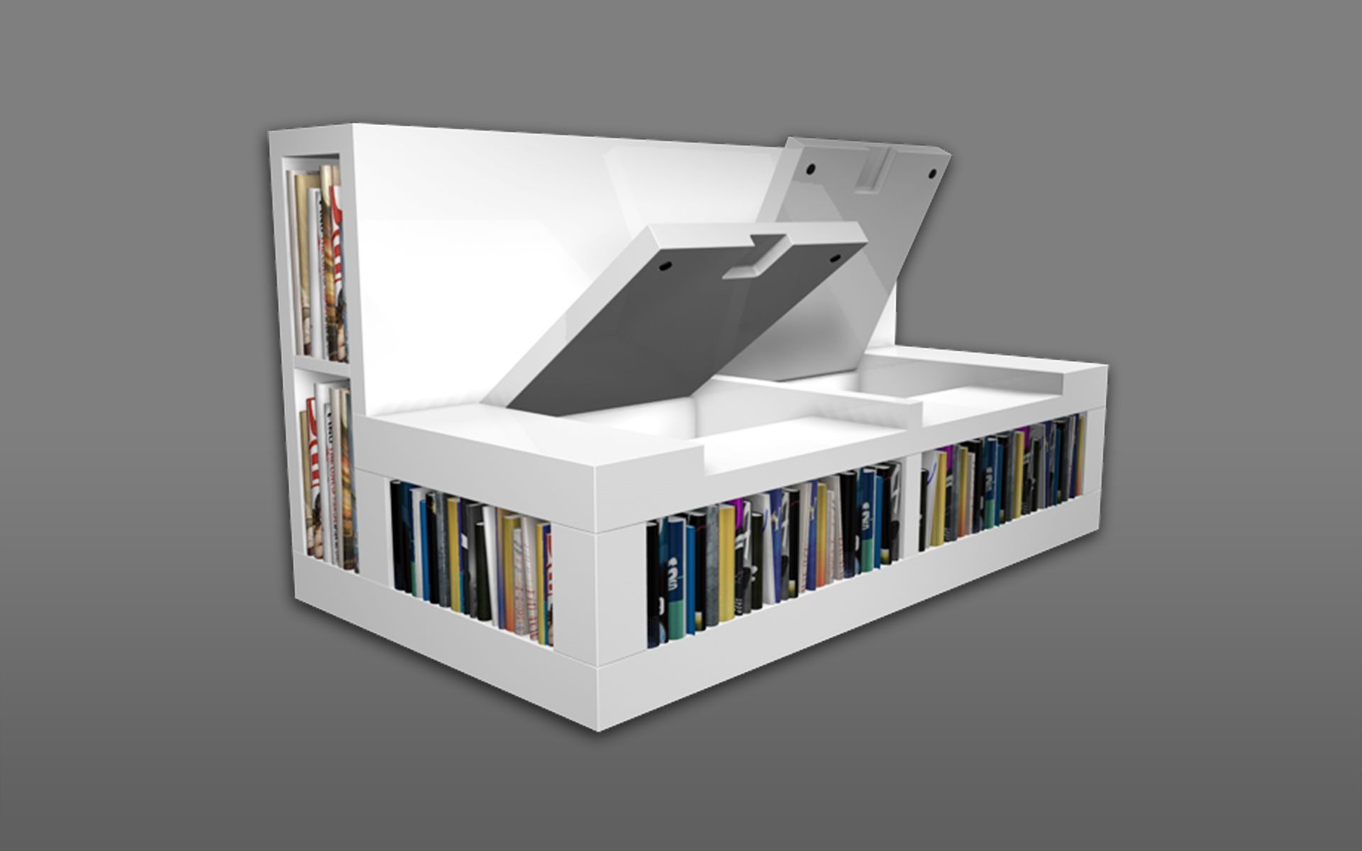 Das Design - aus der Seitenansicht betrachtet, sieht die Bank aus wie ein kleines „b“ - b steht für bookbench, eine Bank mit Staumöglichkeiten für Bücher und Zeitschriften, welche man sich im sitzen & liegen einfach aus den Ablagefächern holen kann, um gemütlich zu „schmökern“. Unterhalb der klappbaren Sitzflächen versteckt sich noch Stauraum für beispielsweise Kissen & Decken. Das ikonische Design wurde beispielhaft mit beschichteten Platten dargestellt, könnte jedoch auch in unterschiedlichen Naturhölzern gefertigt werden.